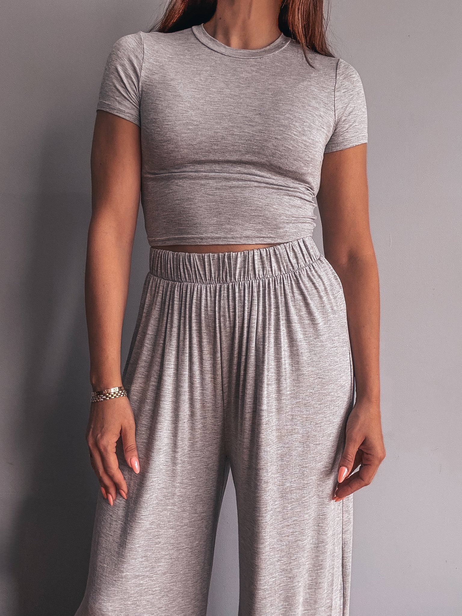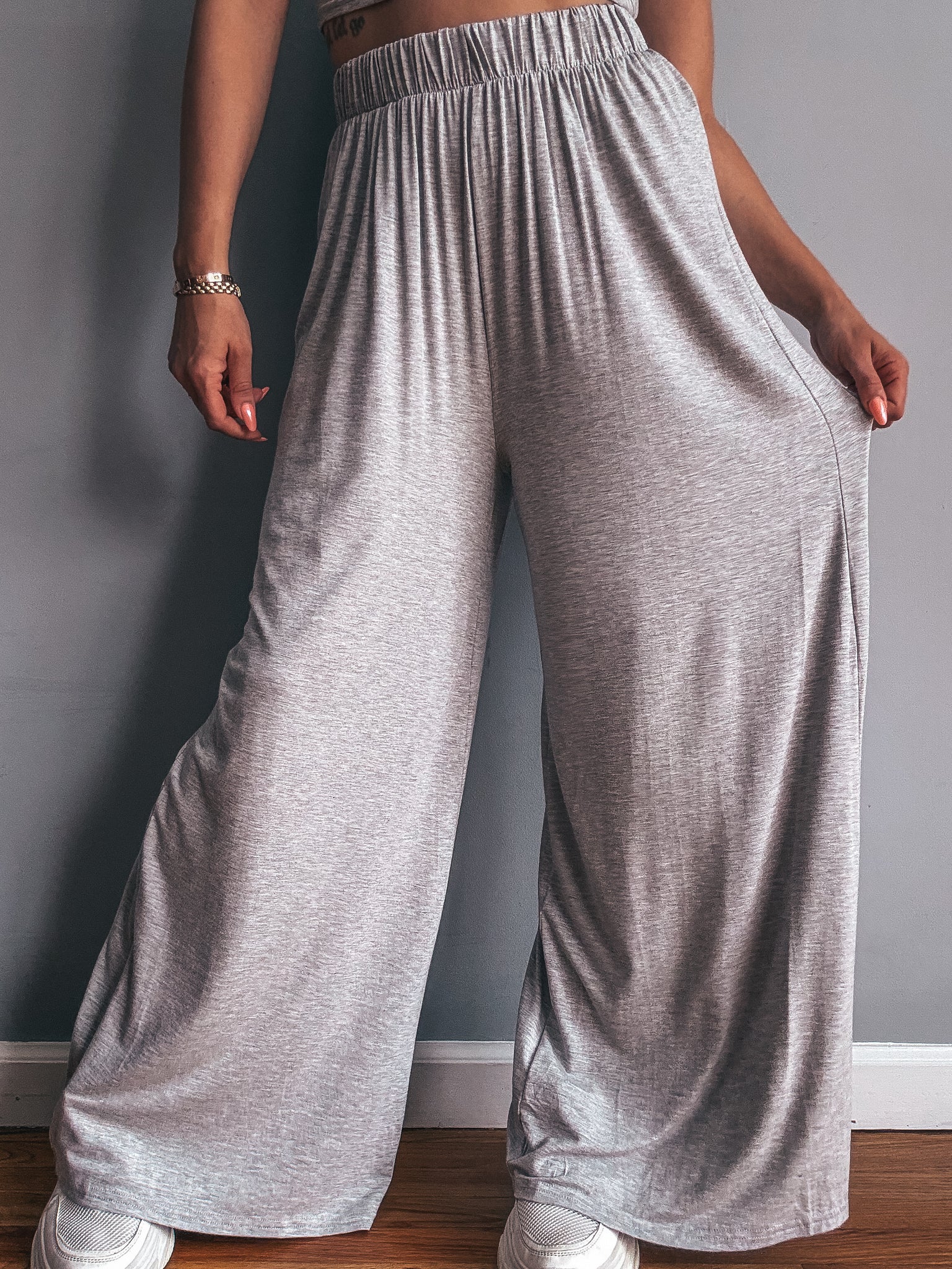 Wide leg pants with stretchy elastic waistband.