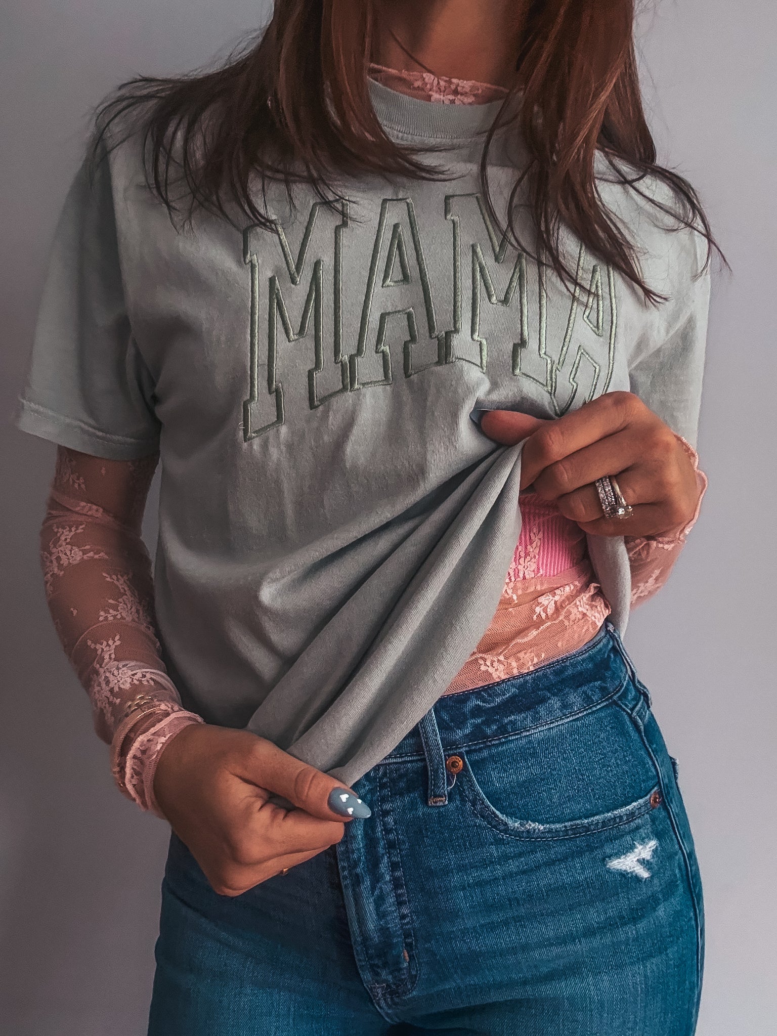 Embroidered Tee paired with our Sweet Sage Lace Top & Pretty Pink Lace Top.